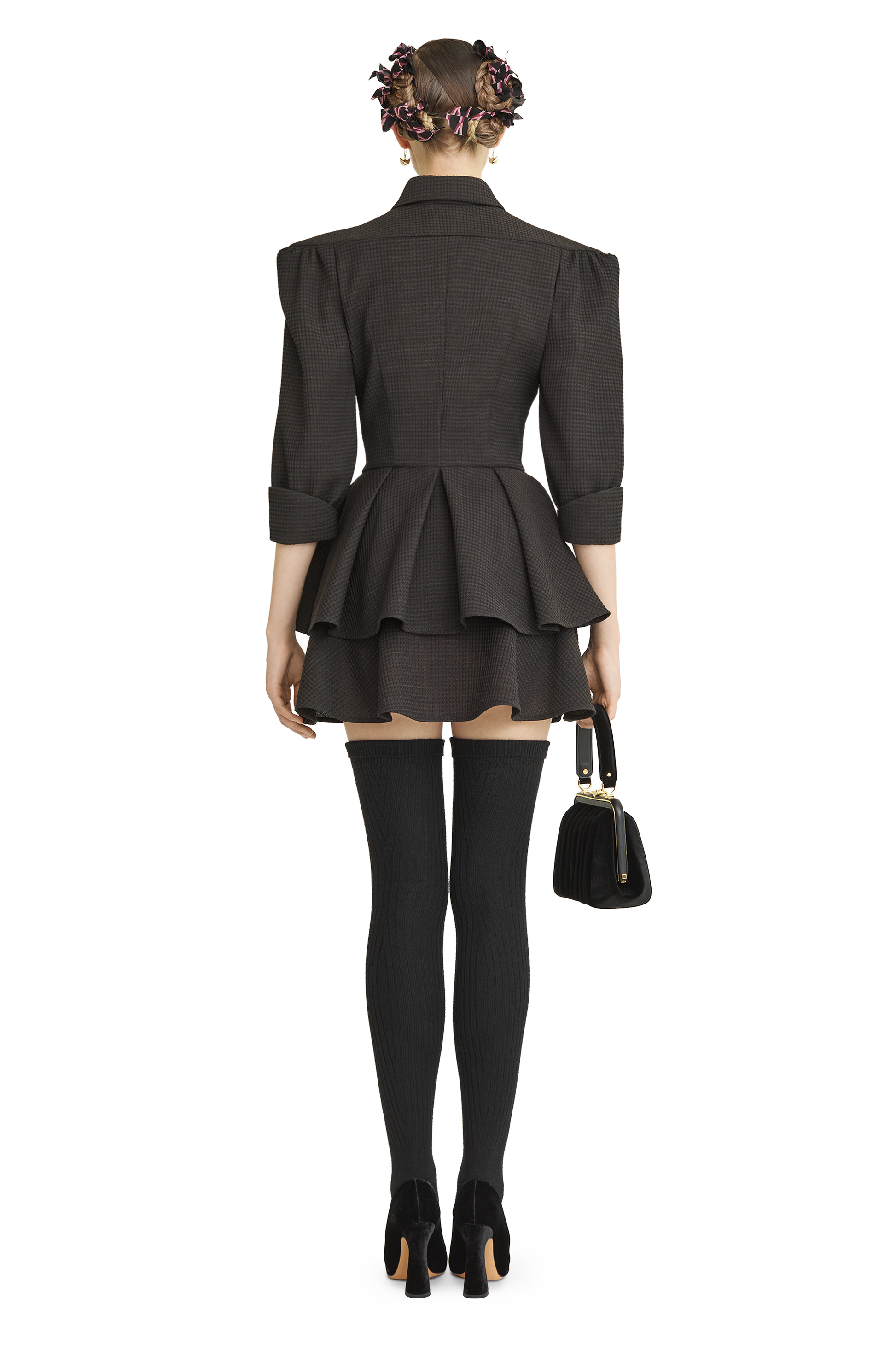 Wool mini skirt with lining. Godet silhouette with a flared ruffle. Waist fit. Zipper and hook-and-eye closure at the back.