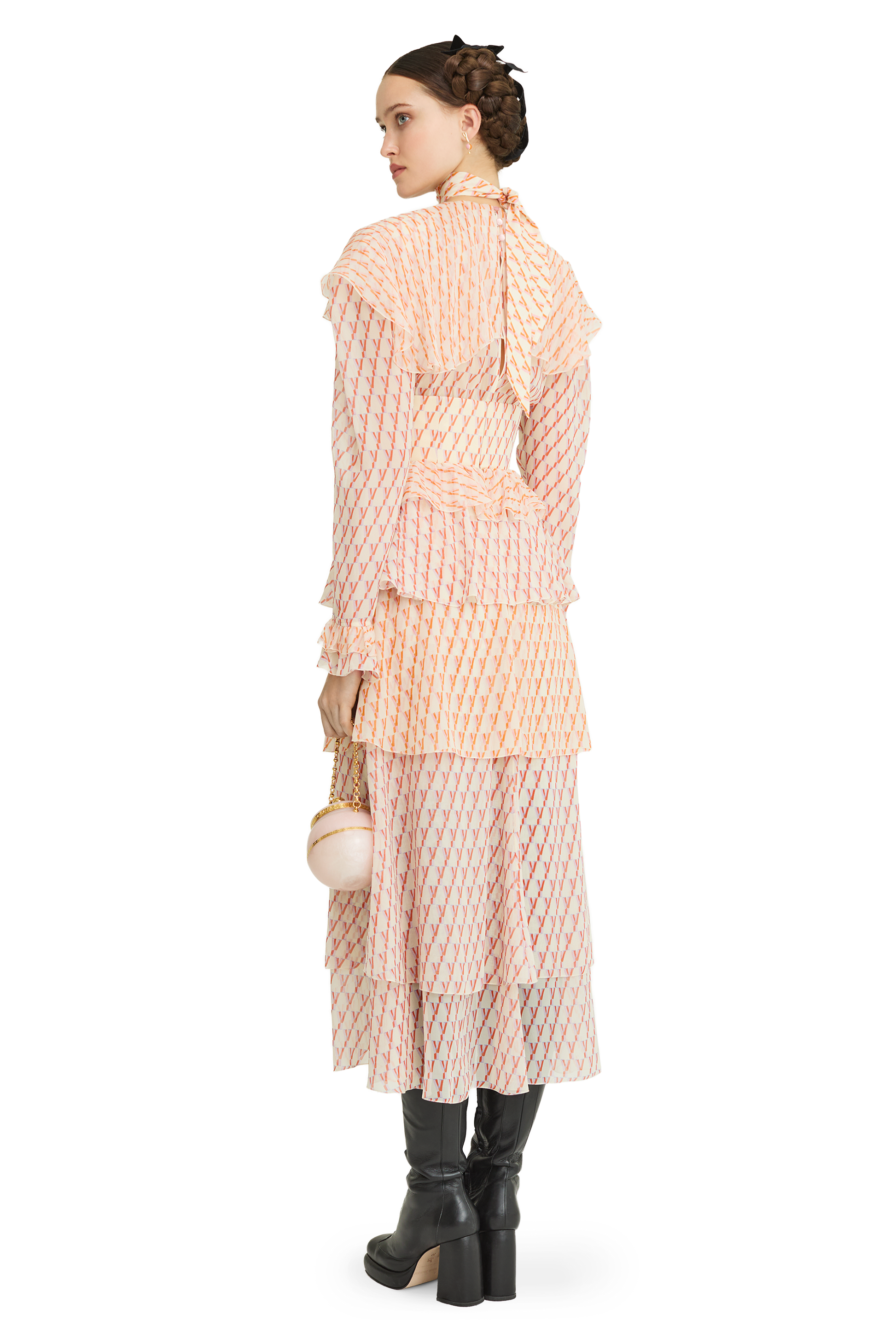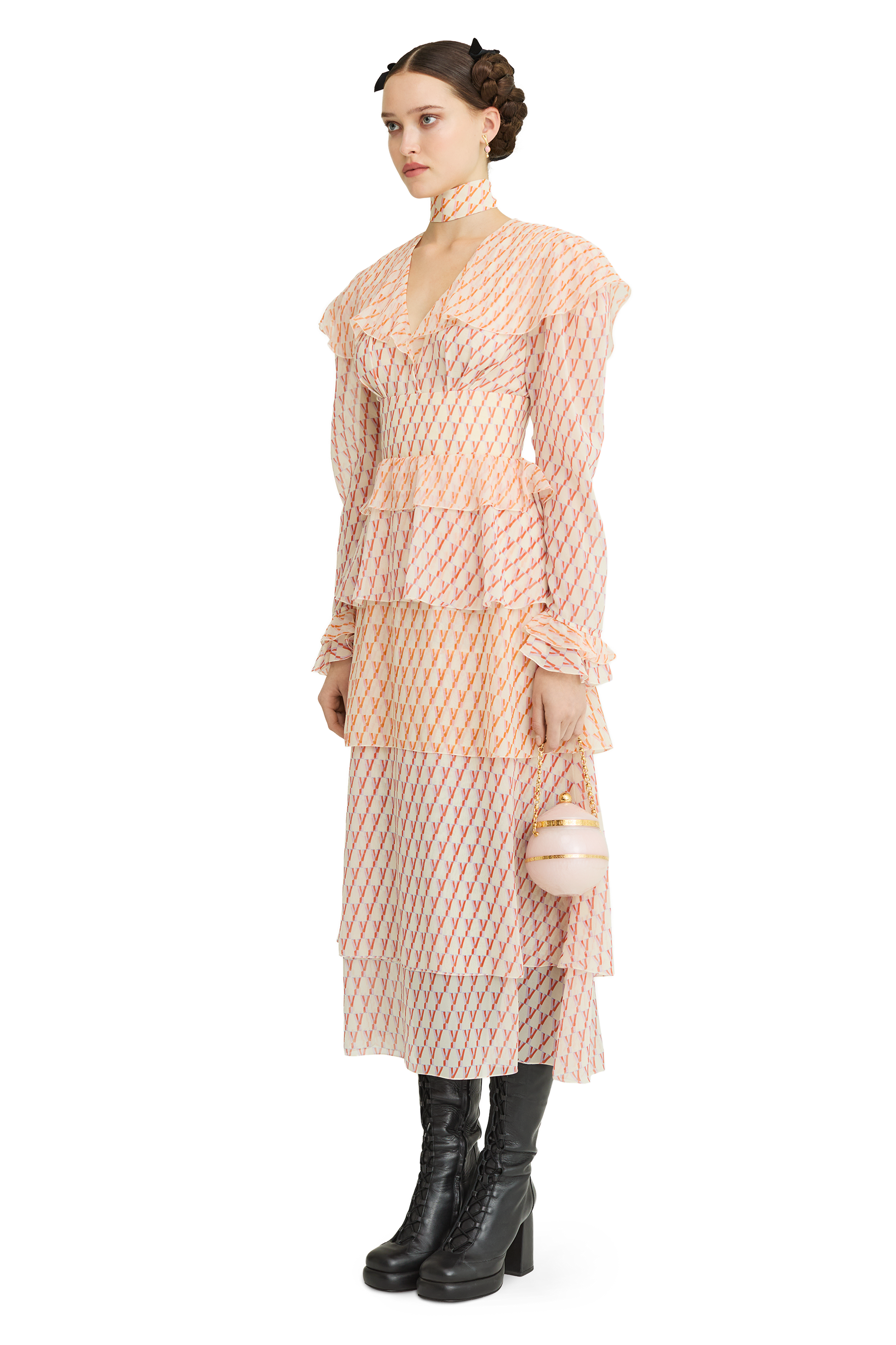 Midi dress made of silk chiffon with a signature print. Fitted silhouette, voluminous collar, built-in corset waistband, tiered skirt. Button, hook, and zip fastening at the back.