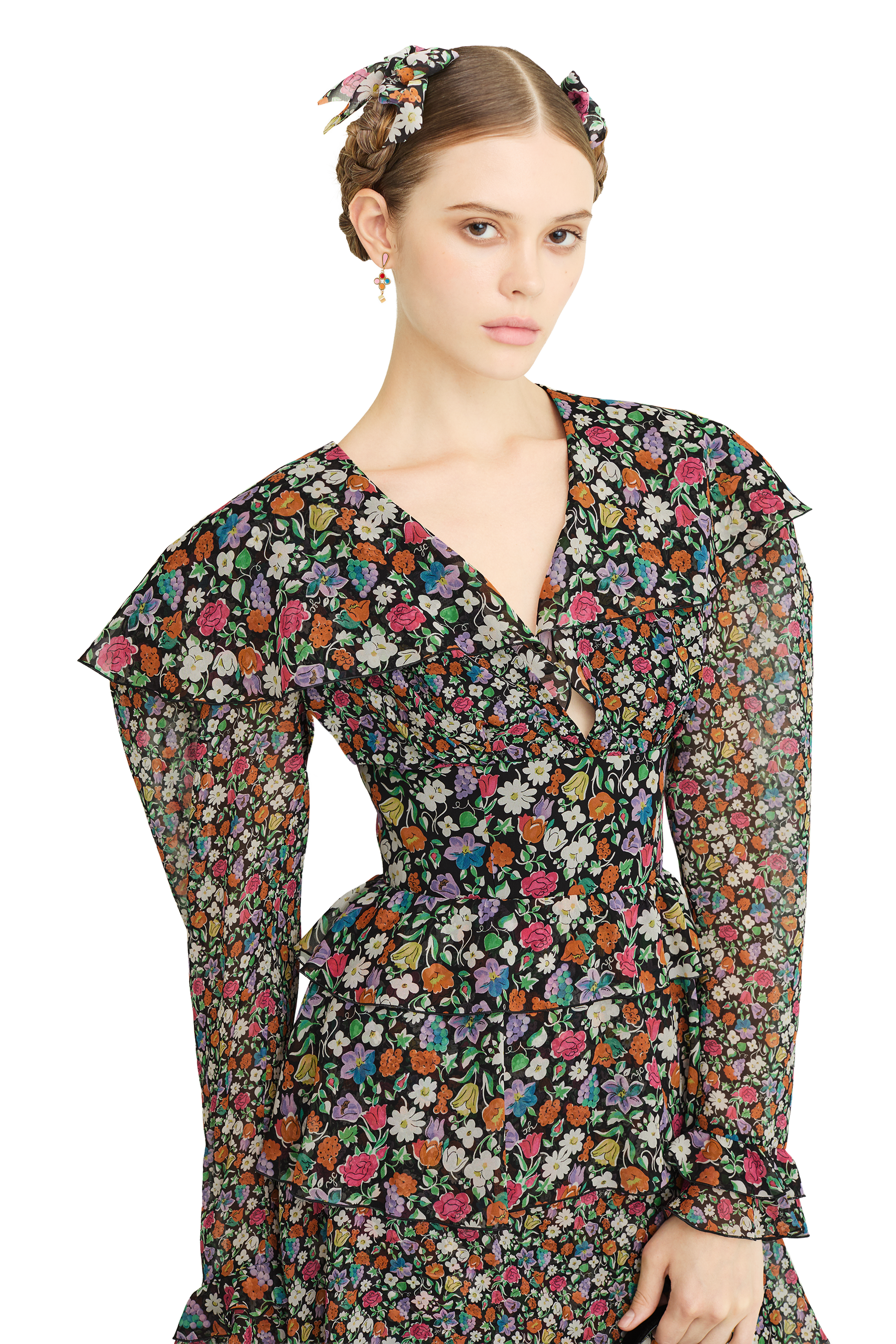 Midi dress made of silk chiffon with a signature print. Fitted silhouette, voluminous collar, built-in corset waistband, tiered skirt. Button, hook, and zip fastening at the back.