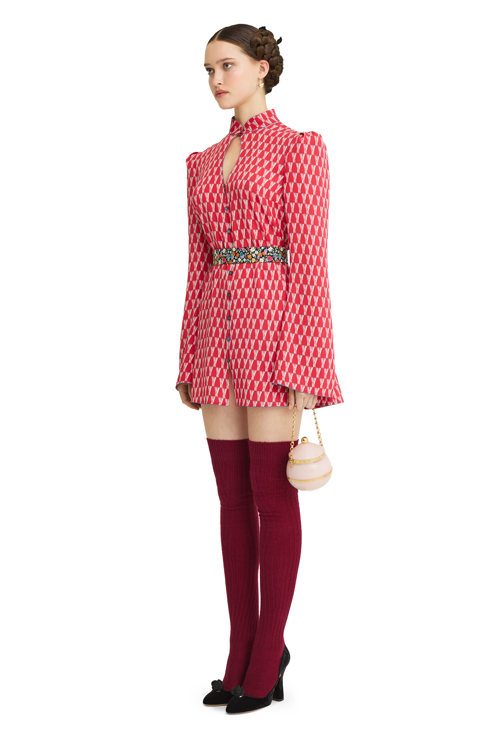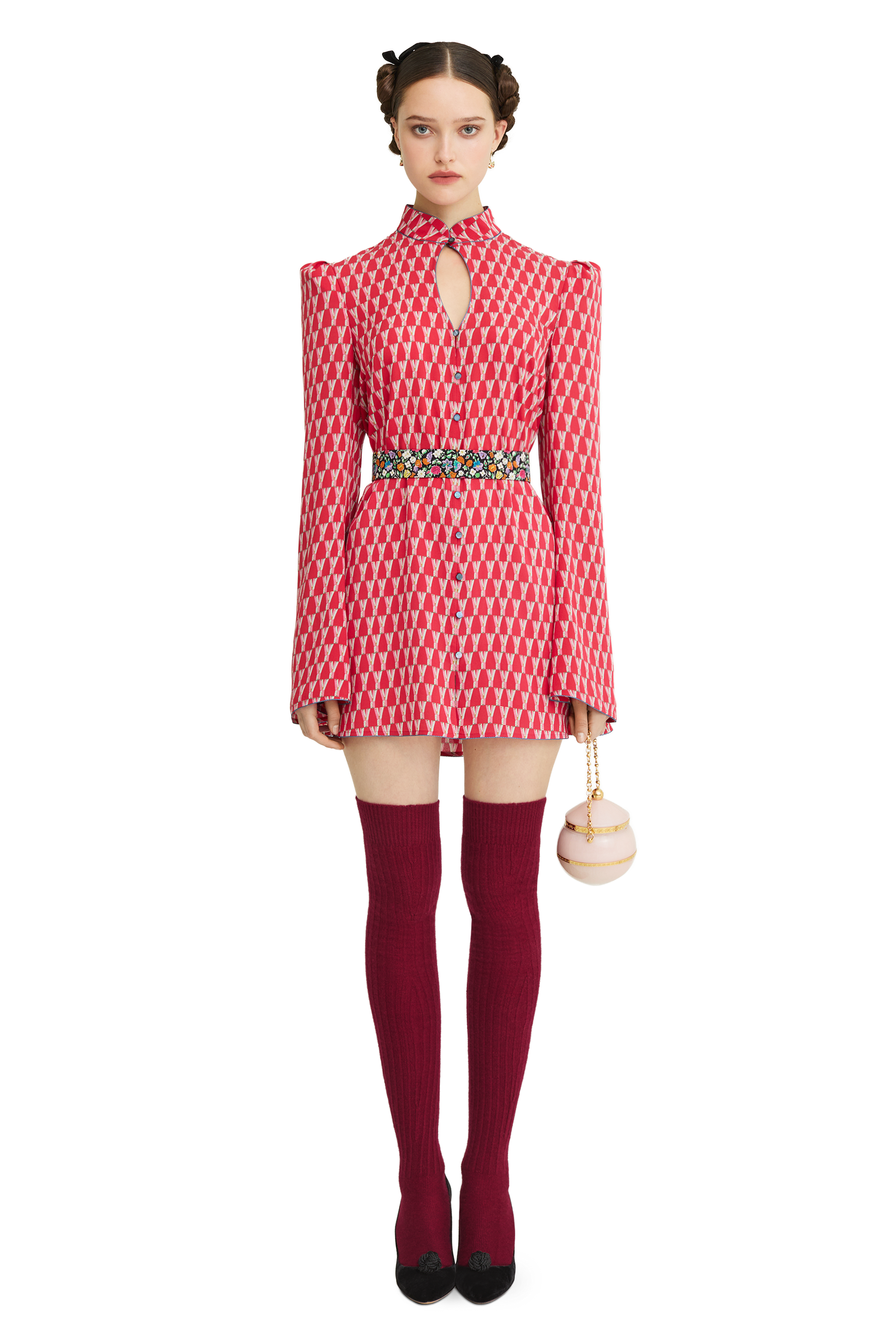 Mini dress made of silk georgette with a signature print. Straight silhouette, stand-up collar, piping trim. Detachable belt with hooks. Button closure at the front.