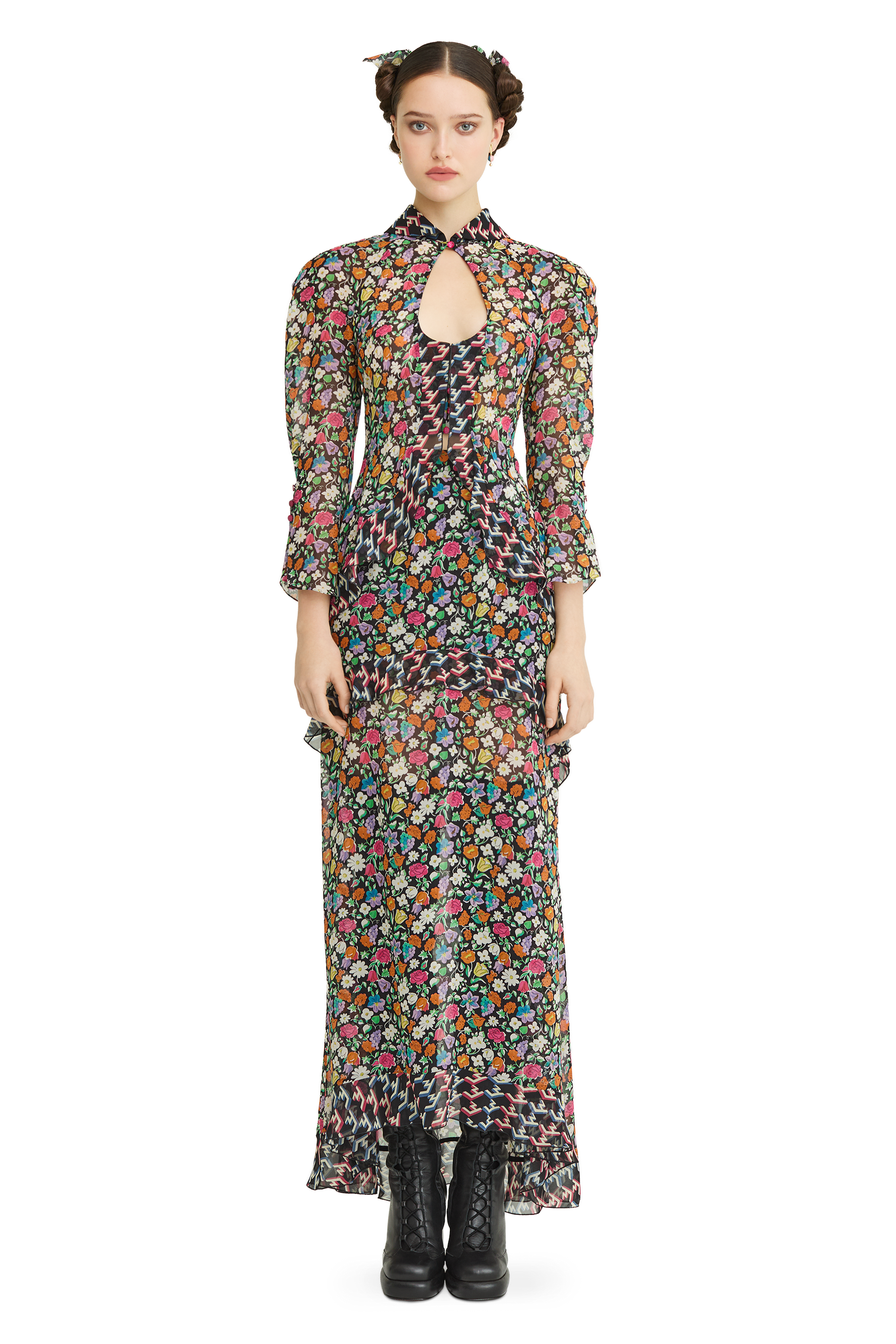 Midi skirt made of silk with a signature print and chiffon lining. A-line silhouette, trimmed with ruffles. Waist fit. Zipper and hook-and-eye closure at the back.